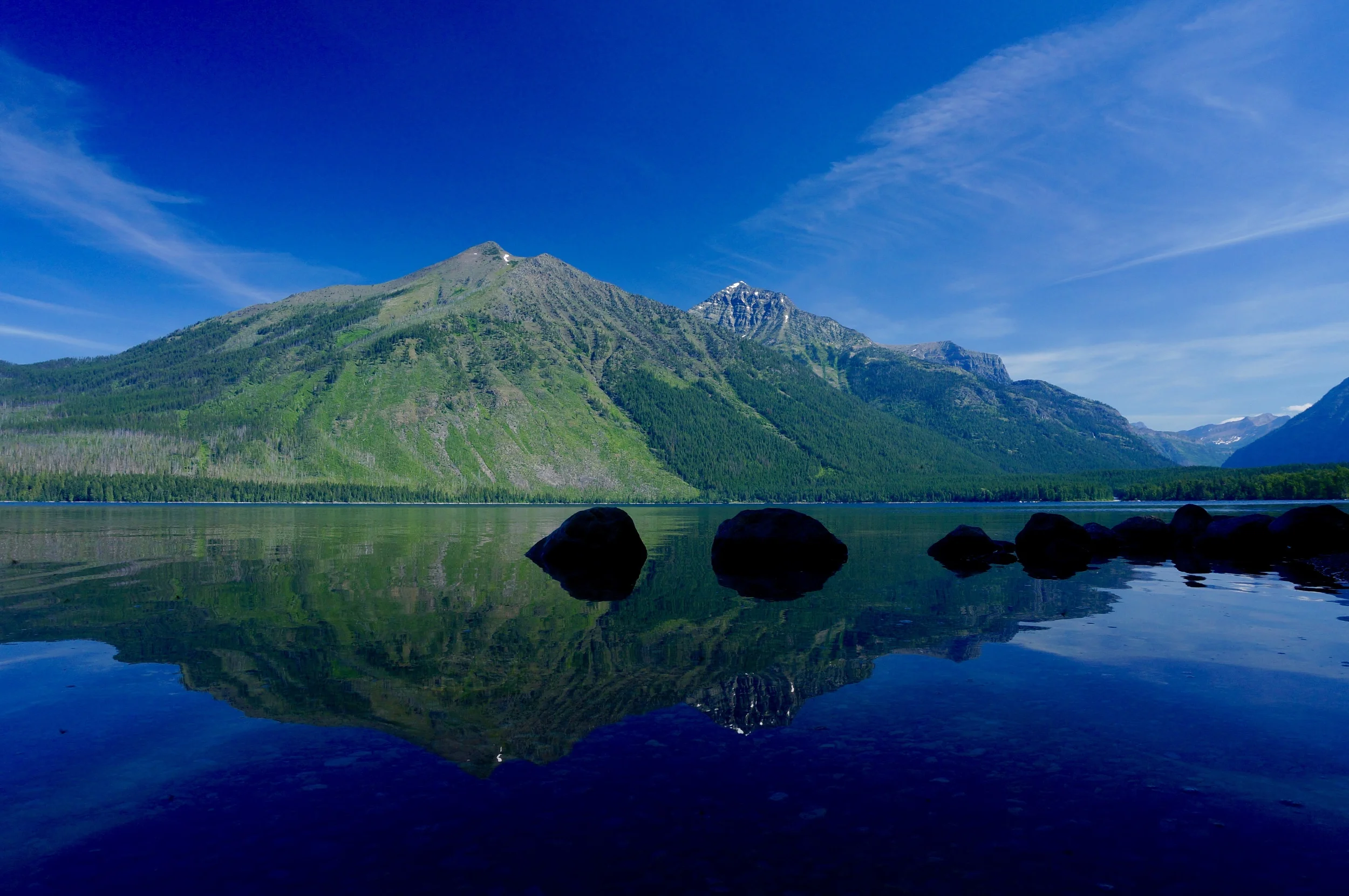 We stop at the Lake McDonald Lodge and walk to the lake. I spot some rocks sticking out of the water which make the scene more interesting.