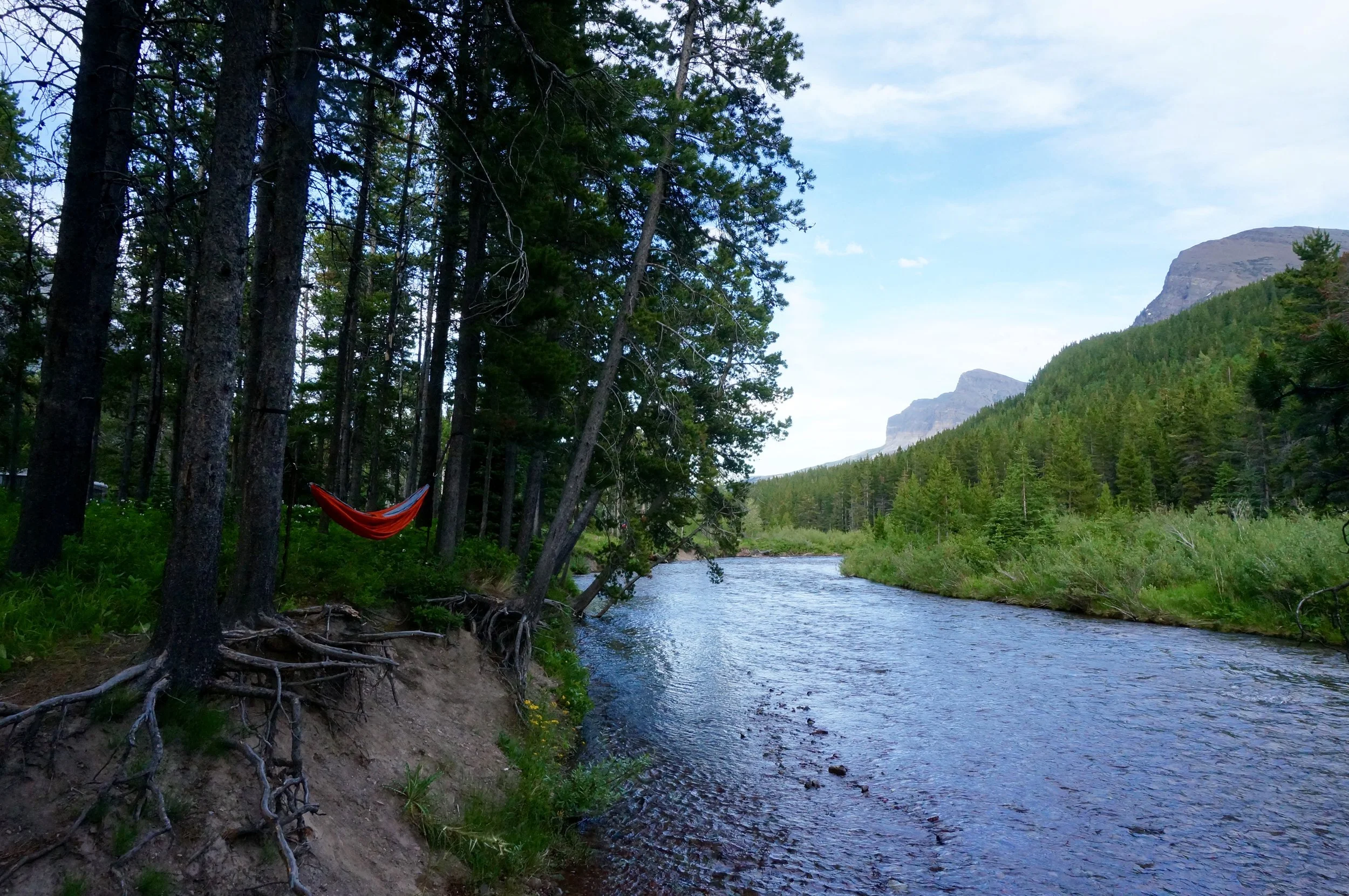 We reach the Many Glacier Campground and decide at once that we have a prime campsite, nestled along Swiftcurrent Creek with an incredible view of Mount Grinnell. Our first priority: hang our hammock and take a snooze.