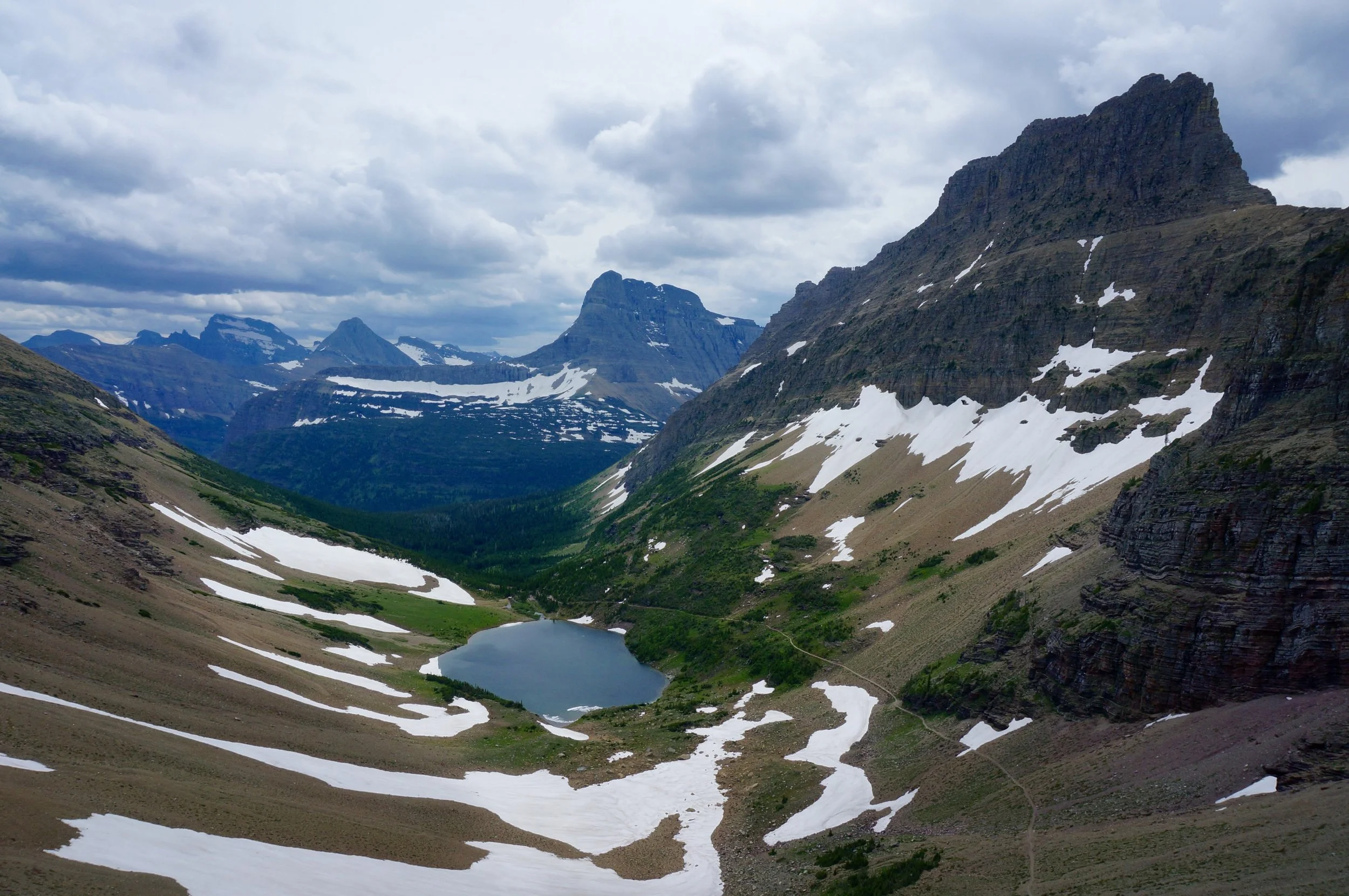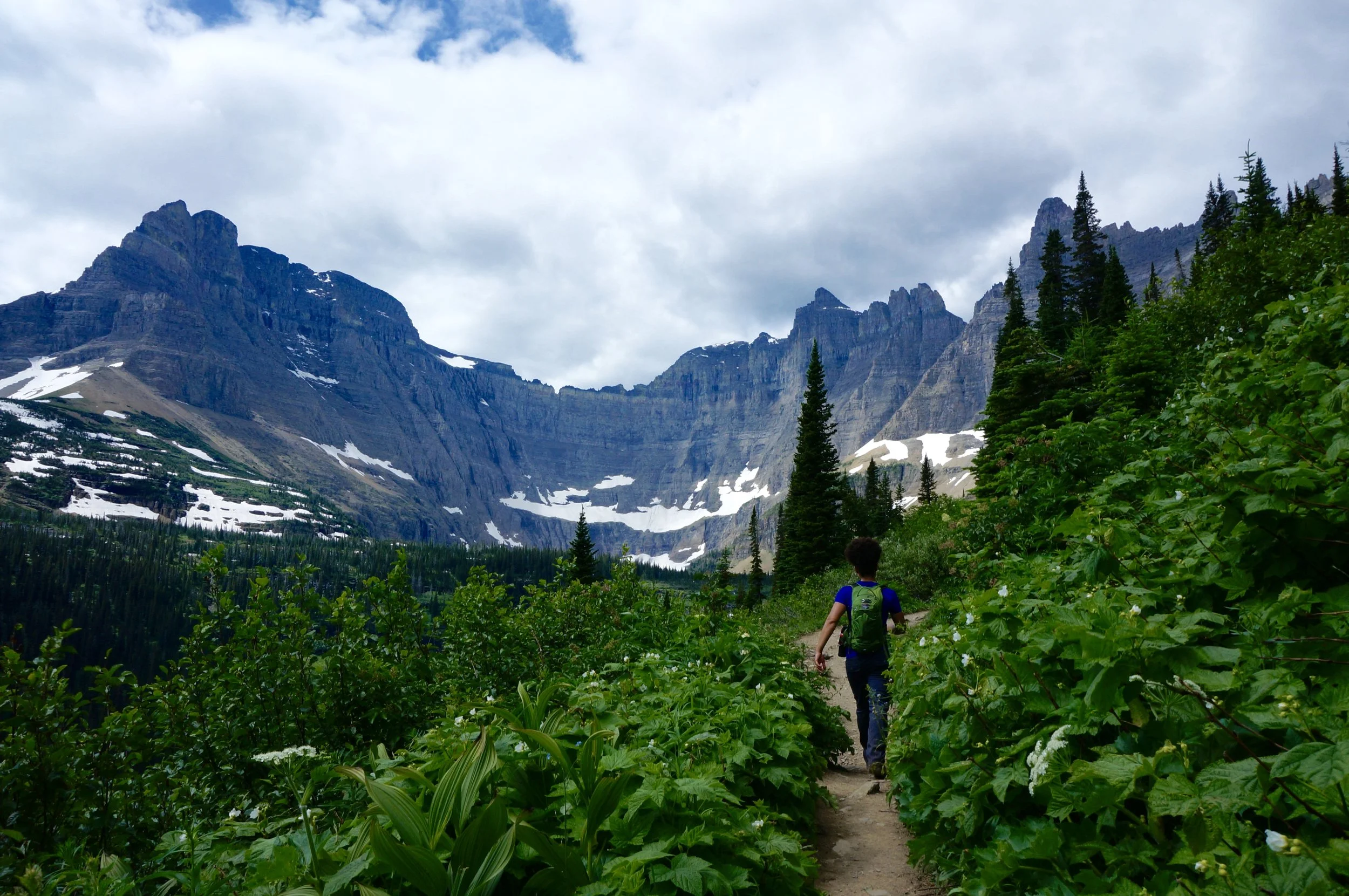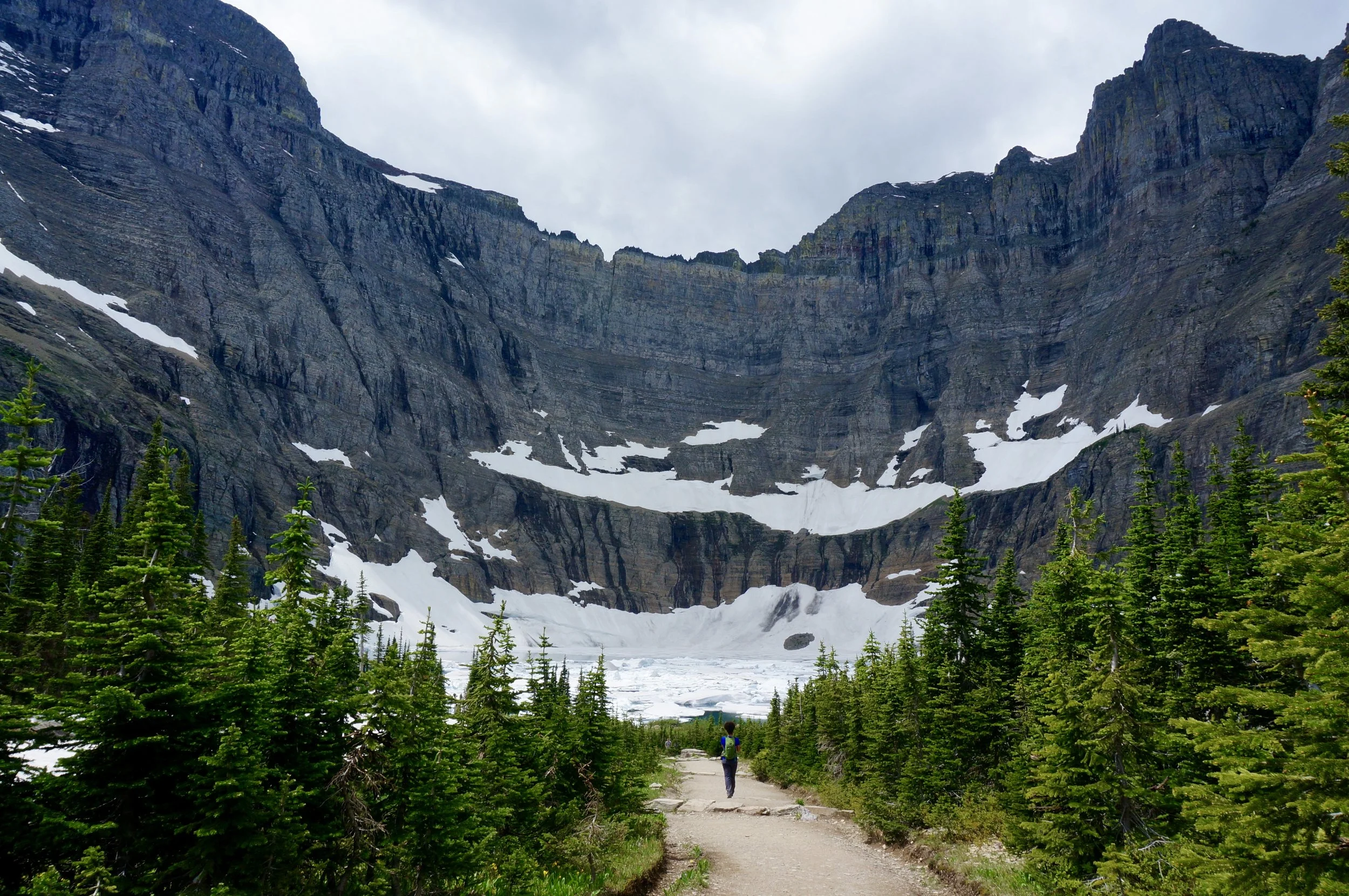 I am surprised by how many hikers do not carry bear spray, especially solo hikers and families with children. Good thing this trail is so busy. The trail returns to the forest and around 3 miles into the hike we emerge from the forest and have a view of the cirque that is home to Iceberg Lake. Clouds settle over the cirque and as we walk closer the temperature drops.