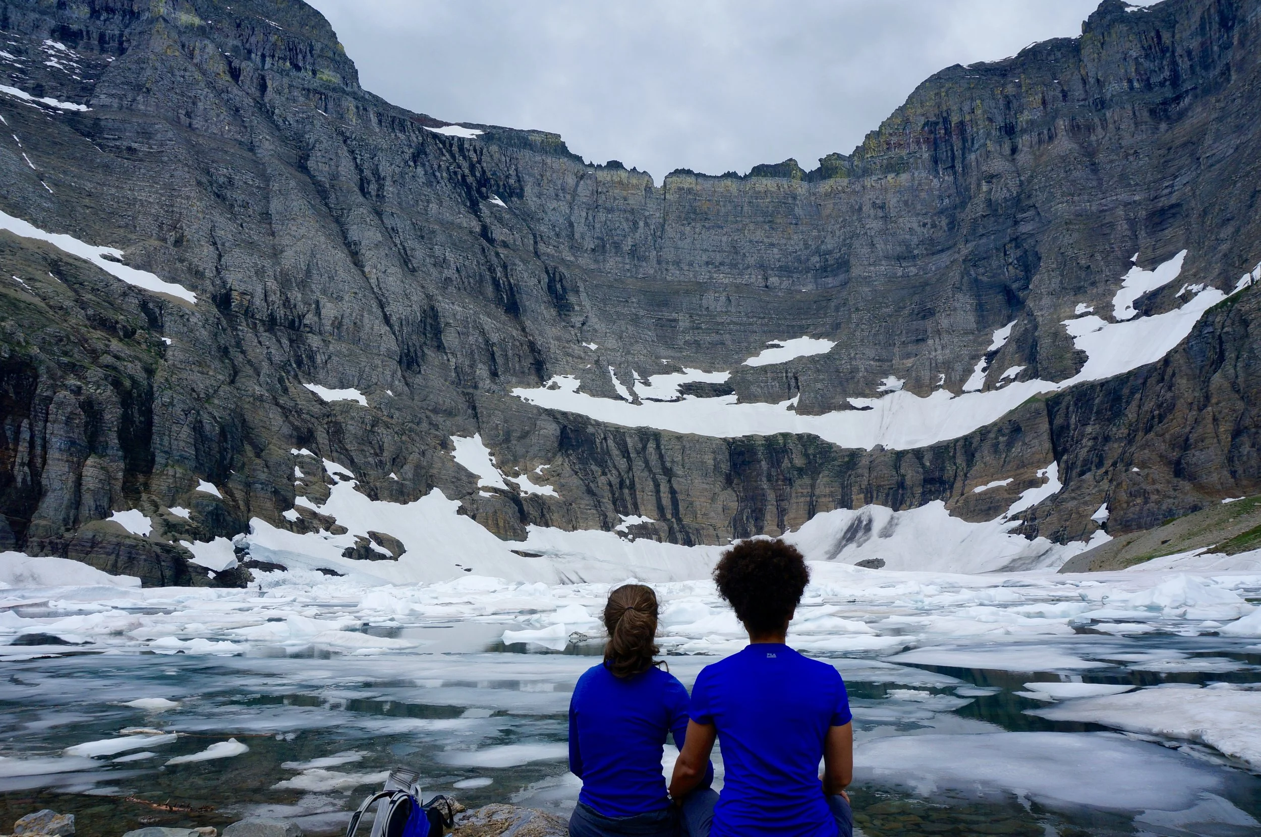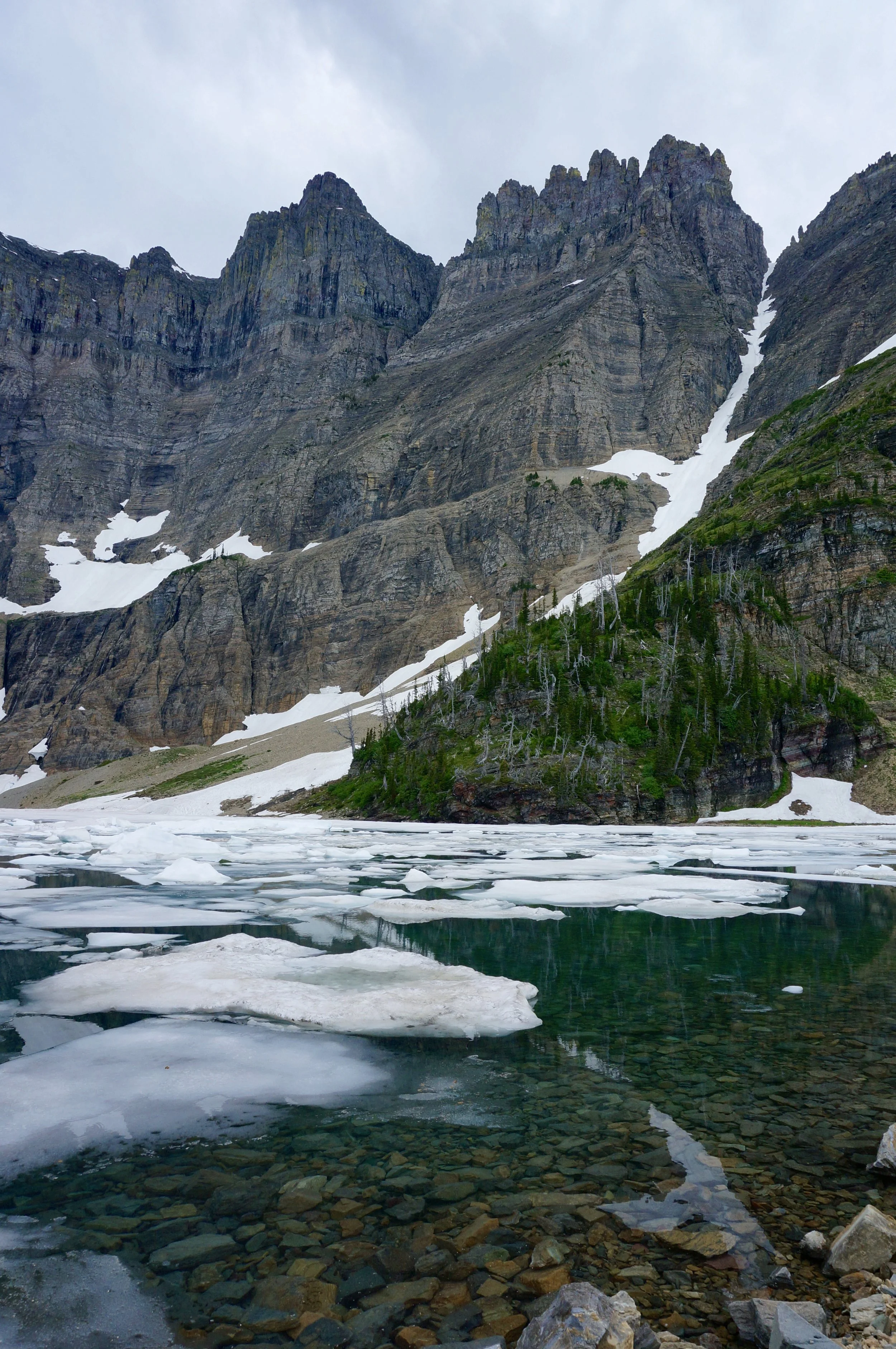 Before long we reach Iceberg Lake and enjoy our lunch on the rocky shore away from most of the other groups. We marvel at the lake, covered in ice, and the granite wall that surrounds the lake.