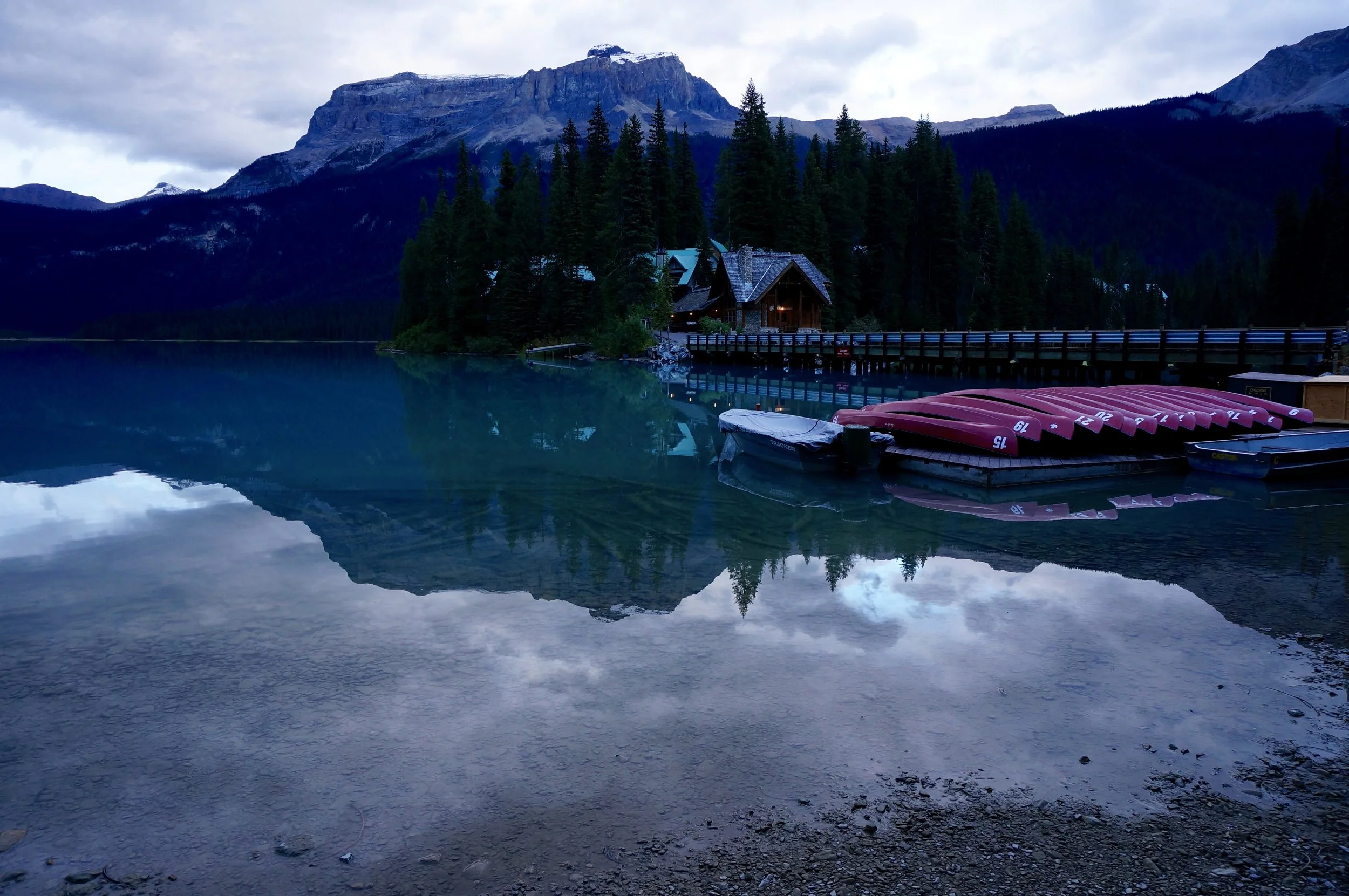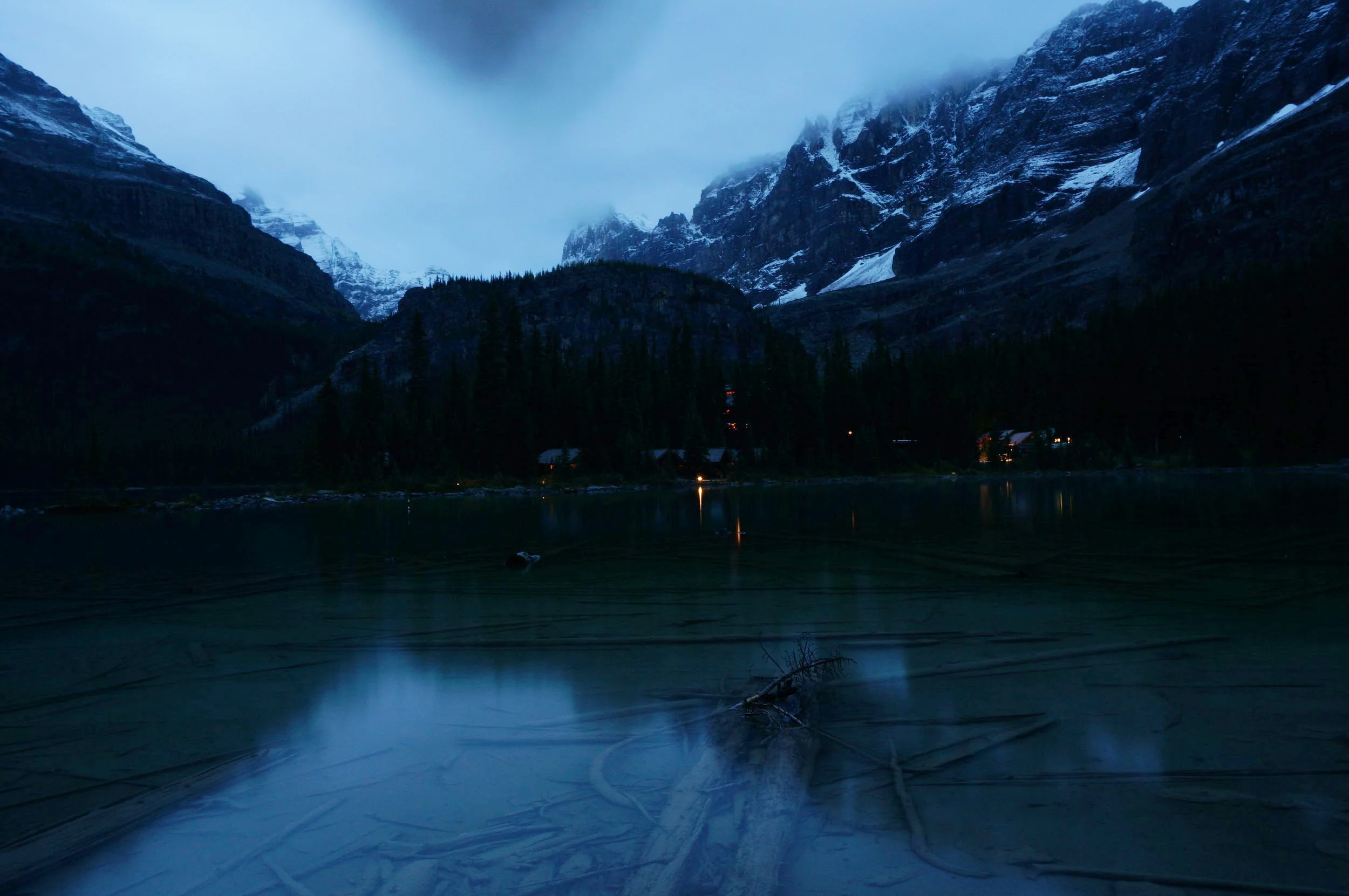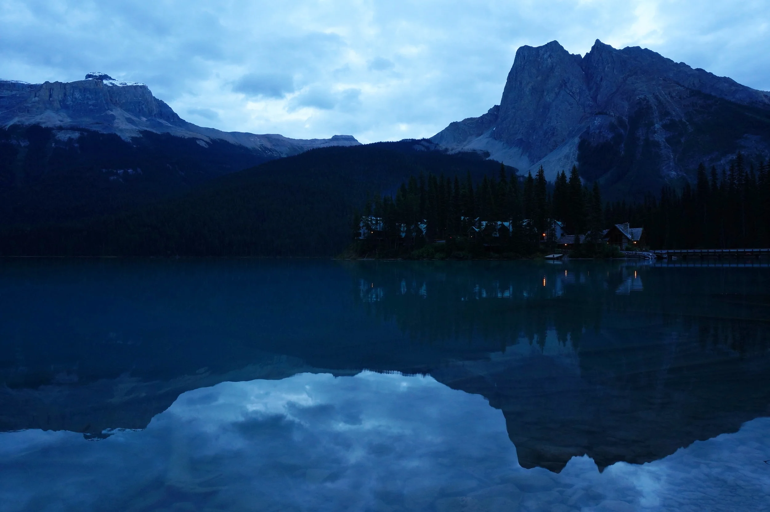 We spend the day before our visit driving the Icefields Parkway (another post coming soon) and stop in Lake Louise for a quick dinner before driving to Emerald Lake to catch the sunset. We arrive a little late as the sun had already fallen below the surrounding mountains. At least ten photographers are set up on the lakeshore with their expensive looking cameras facing the Emerald Lake Lodge. I imagine they are all competing for the same contract.