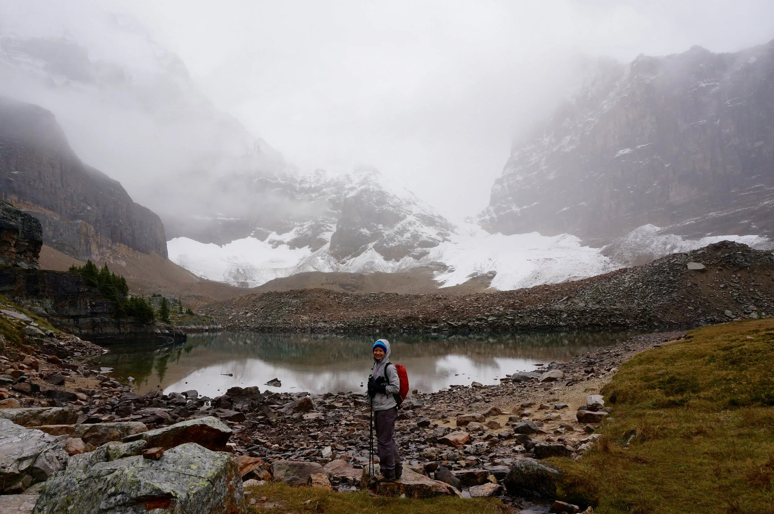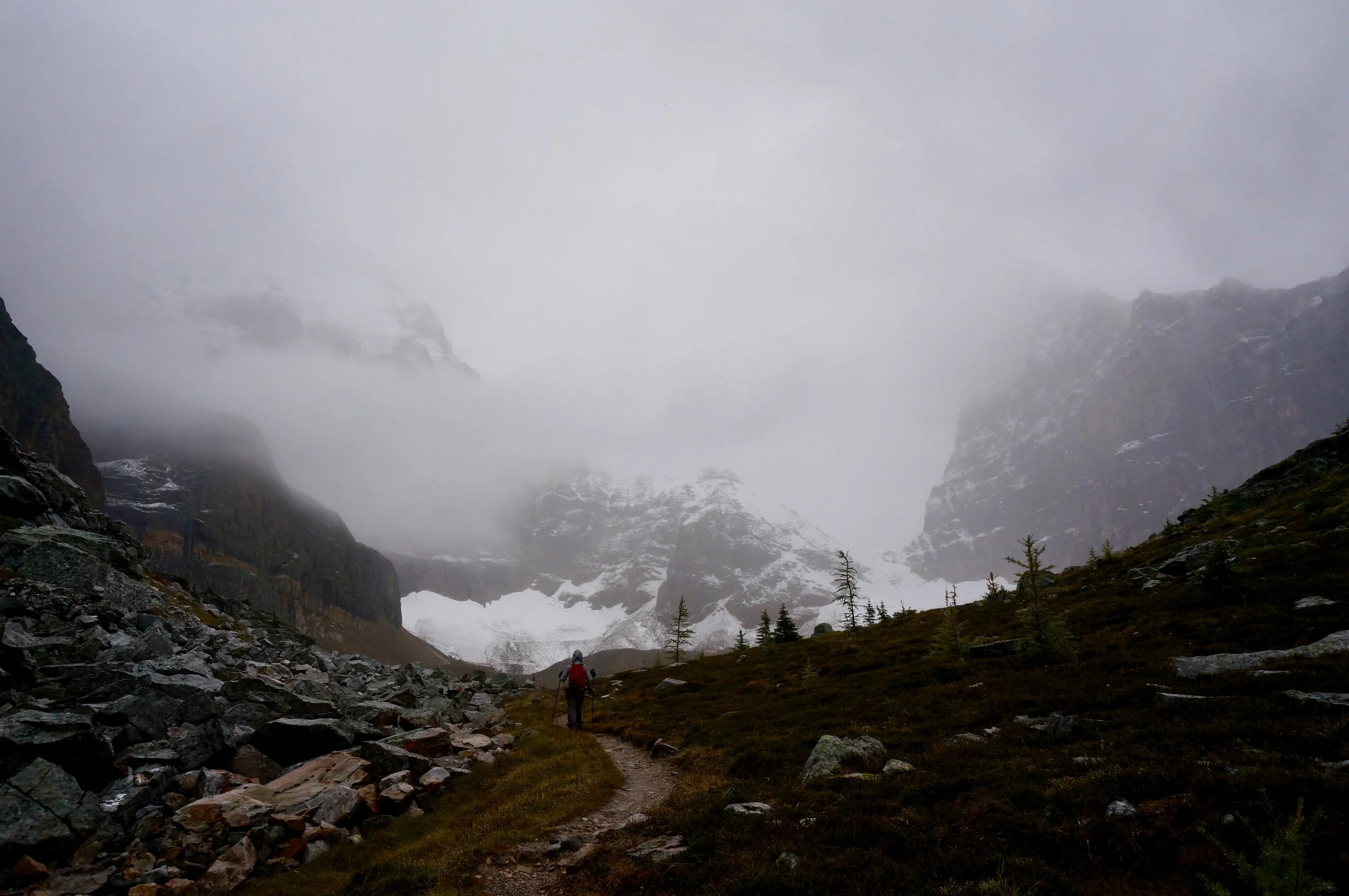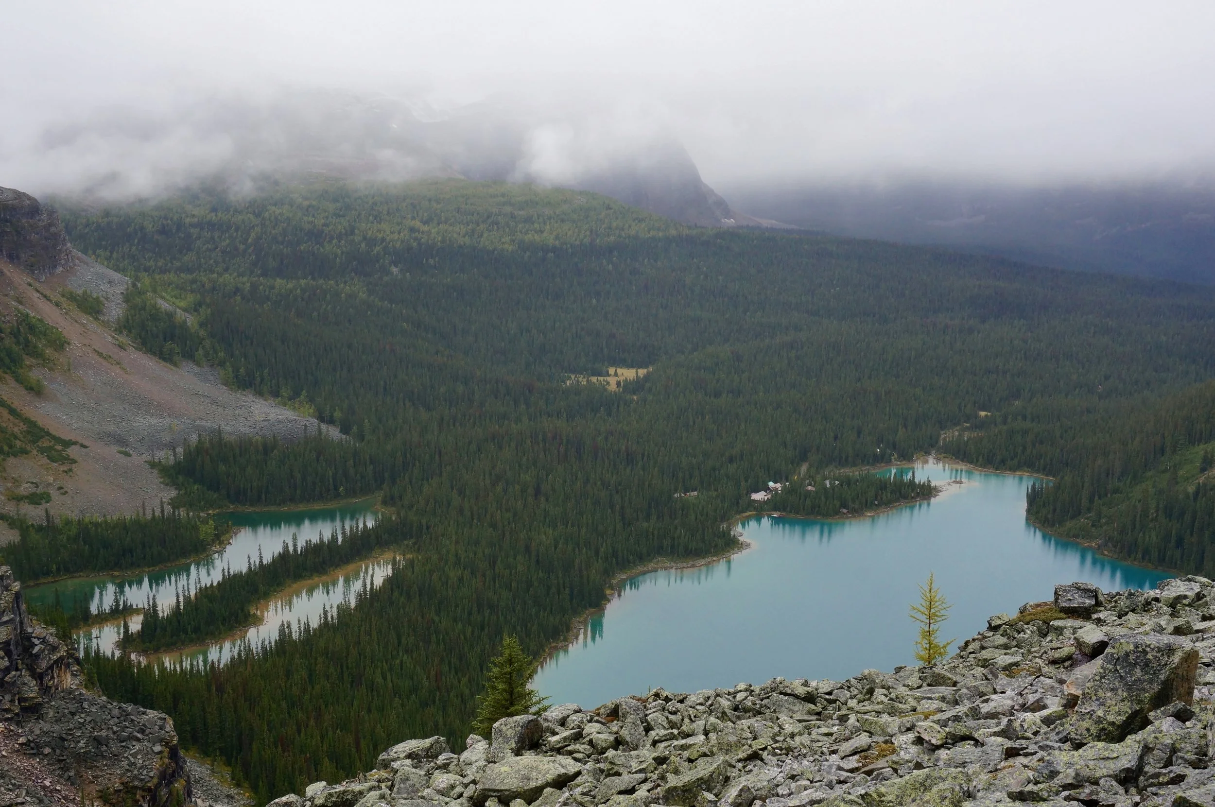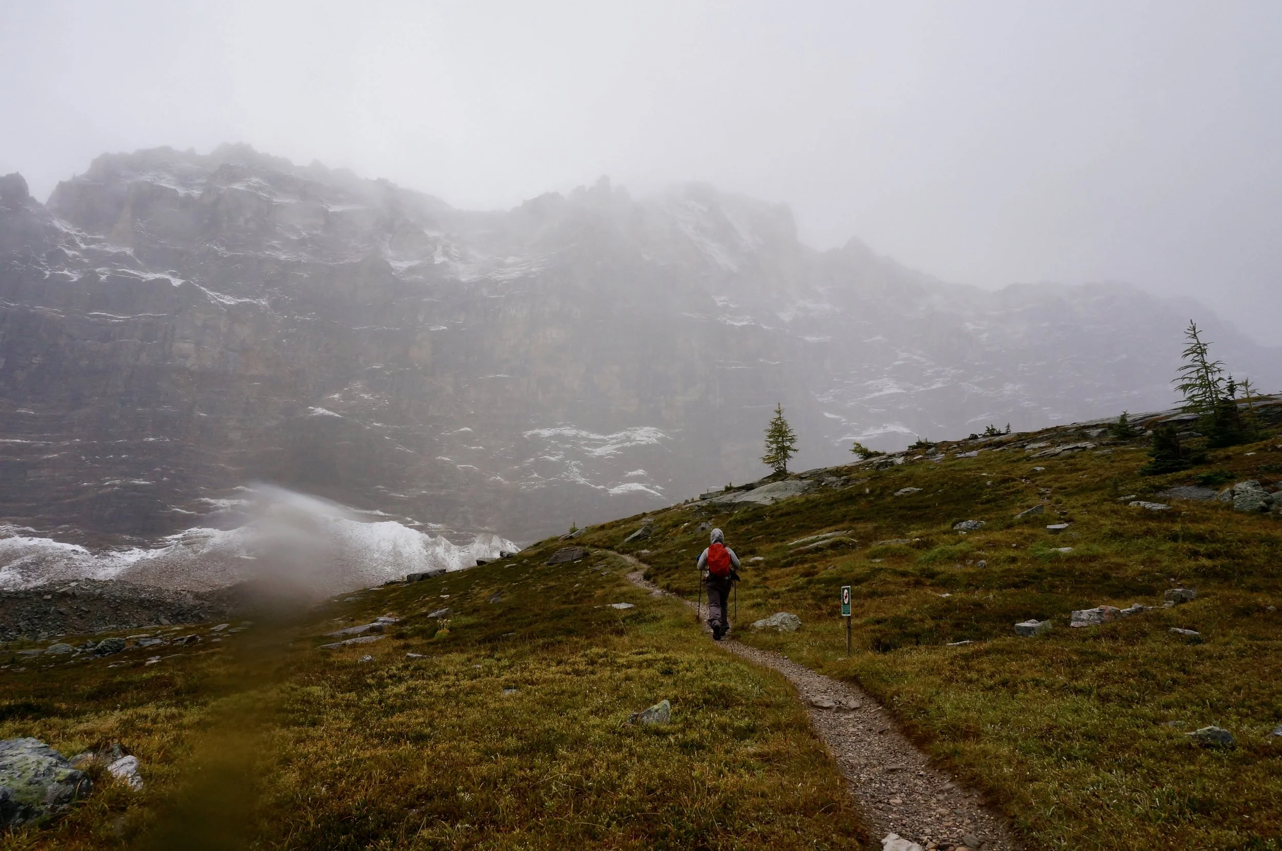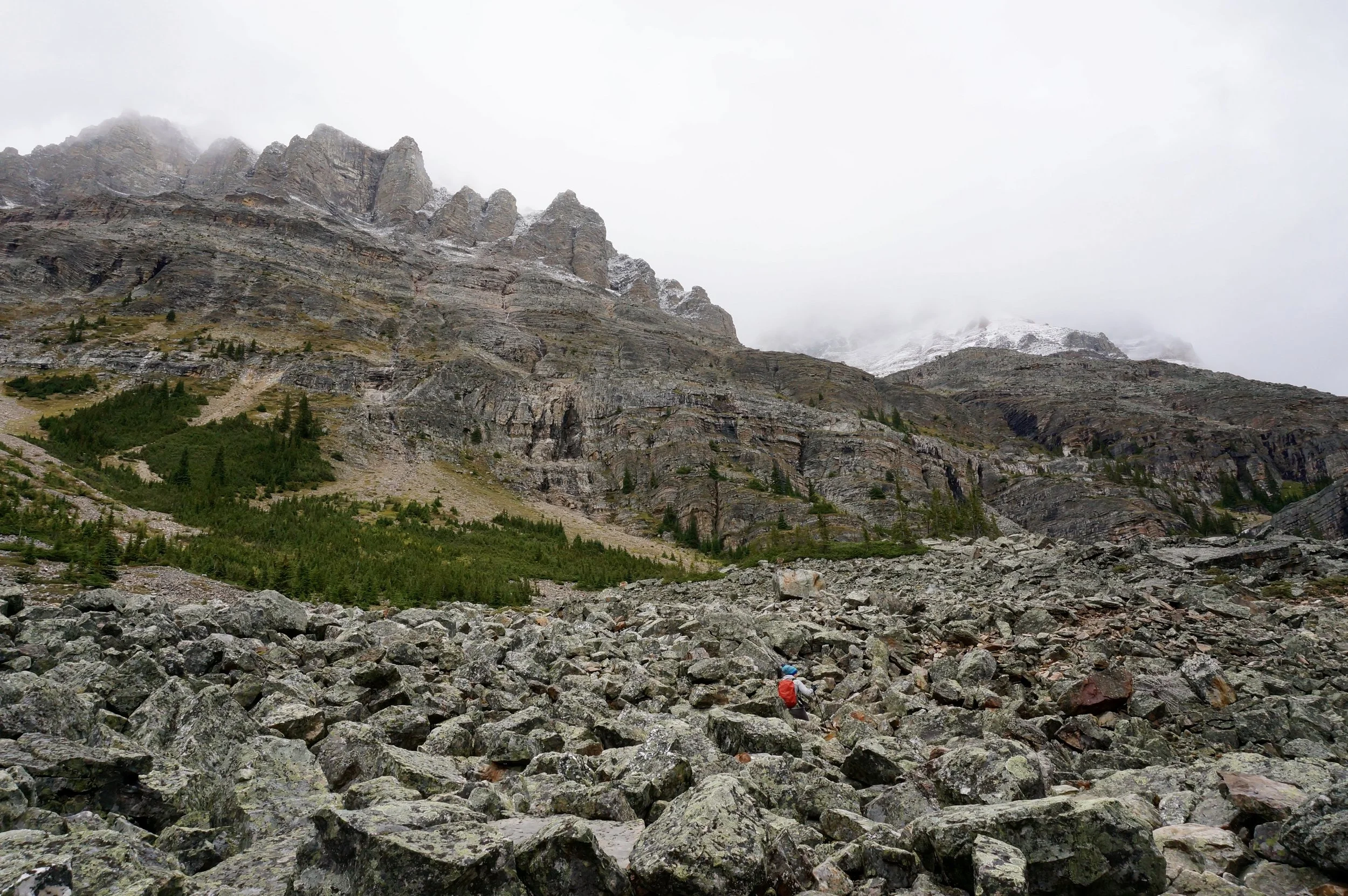 At this point, we decide to take a connector trail back to Lake O'Hara instead of taking the All Souls trail to Lake MacArthur. We can see the alpine route is in a cloud and I imagine the visibility would be poor. Not ideal conditions.