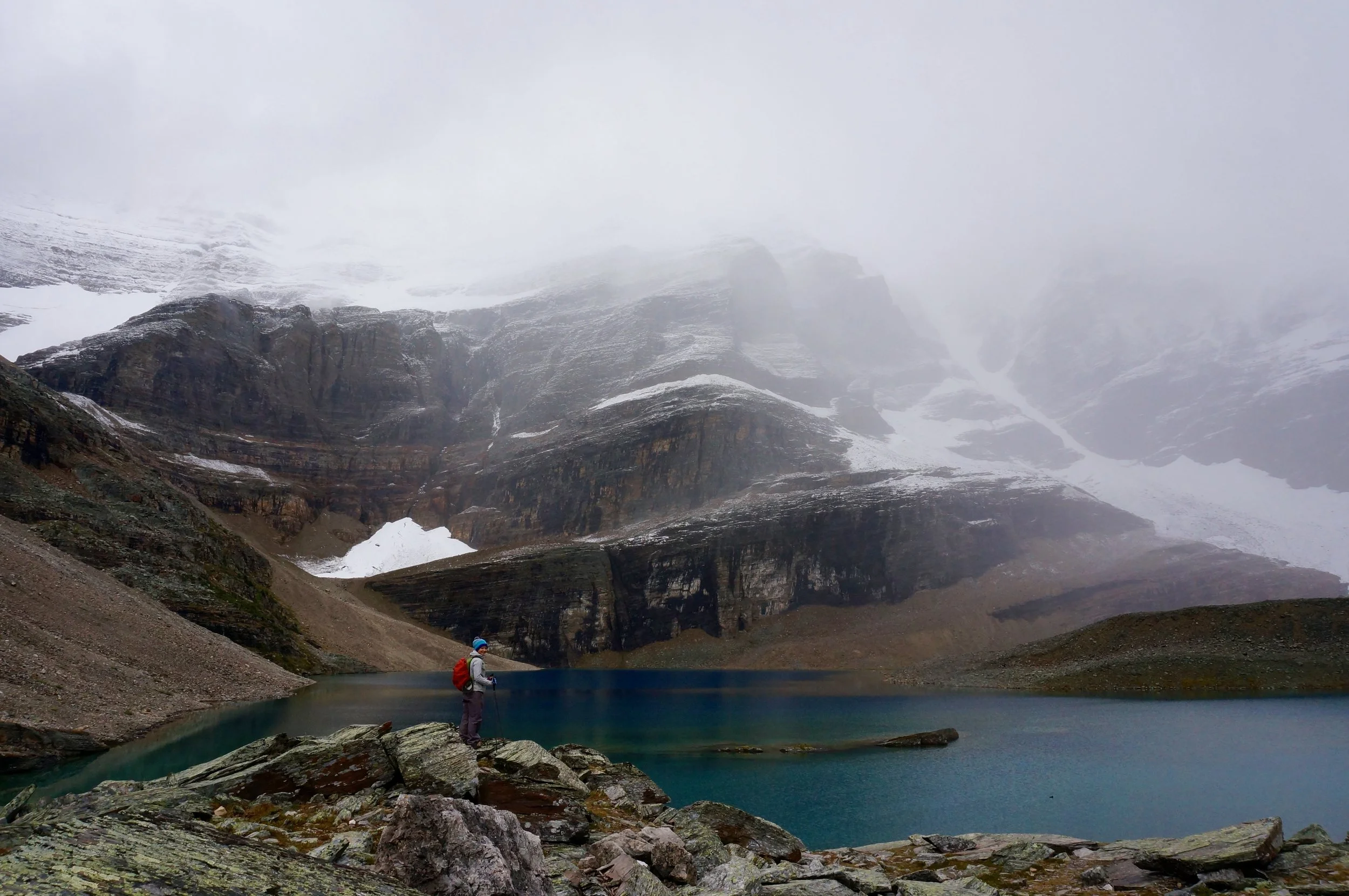 We take the alpine route to Opabin Lake along the Yuckness Ledges. The snow continues for a while and then tapers off. The views are impressive.