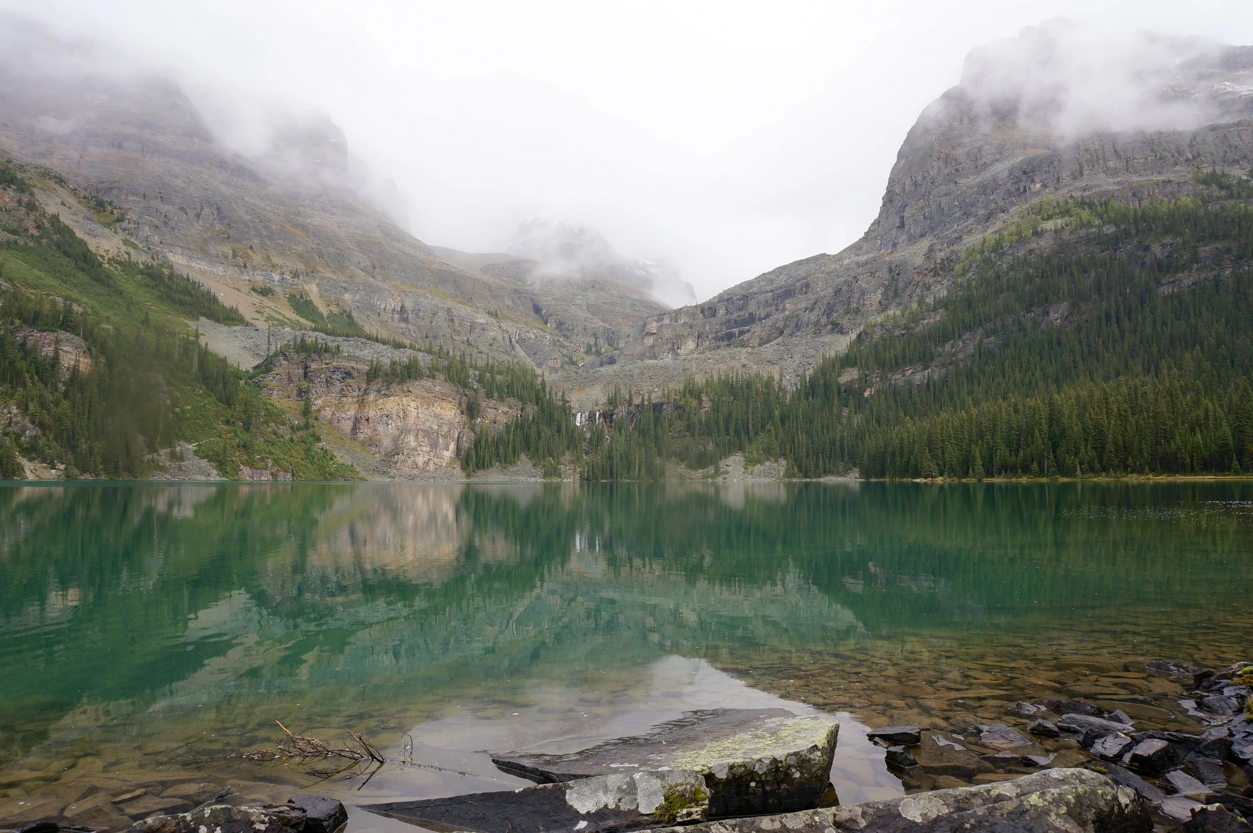We spend the entire afternoon playing cribbage and talking to other campers in the cooking shelter as a steady rain falls. After dinner the rain lets up so we walk to Lake O'Hara for one more view of the lake.
