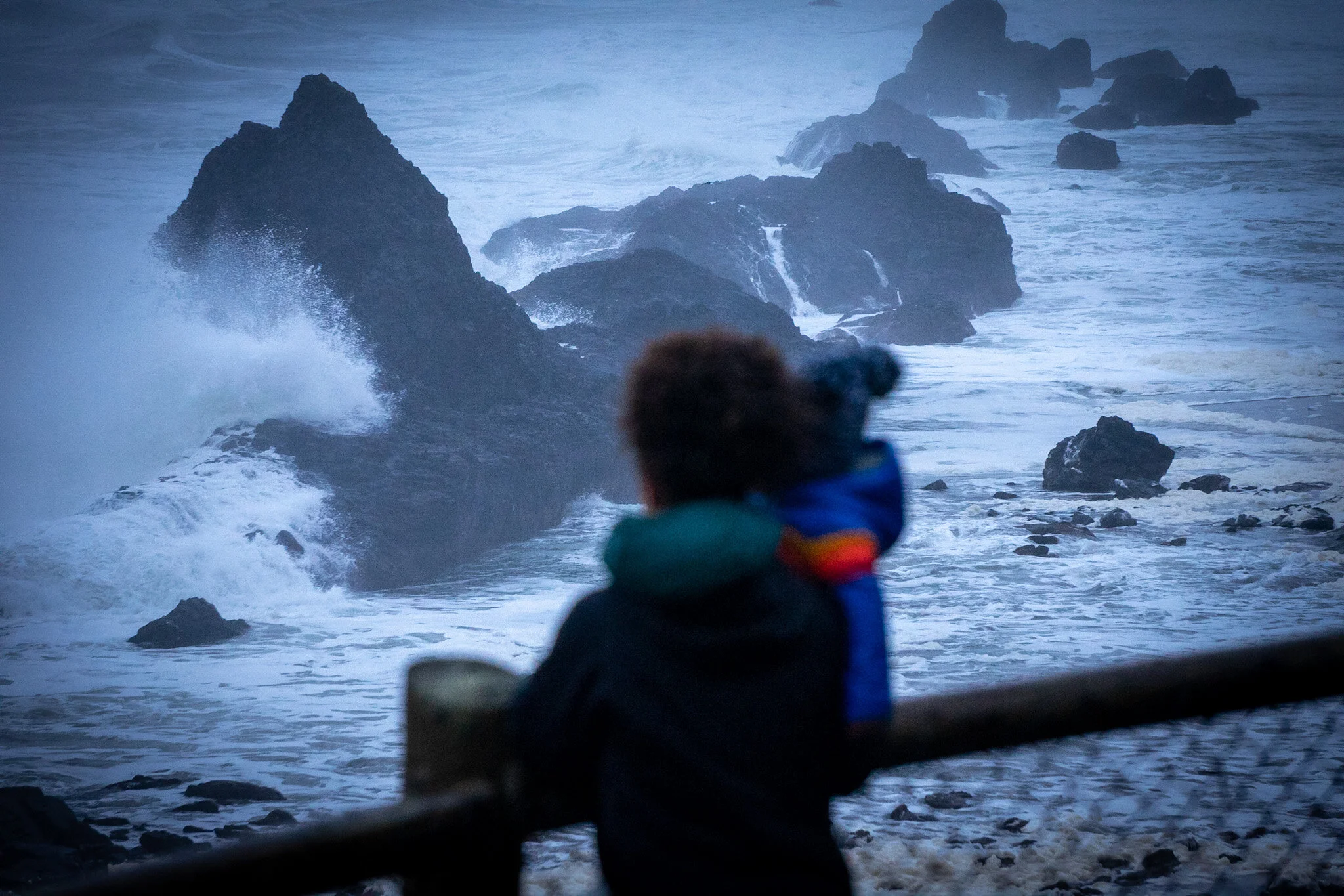 After Luca’s nap, we head down to the Seal Rock Recreation Area for a short walk. Luca enjoys jumping in puddles in the parking lot. The sky darkens as a light rain falls, and waves crash fiercely into the rocks near the shore. The power of the ocean is terrifying and humbling.