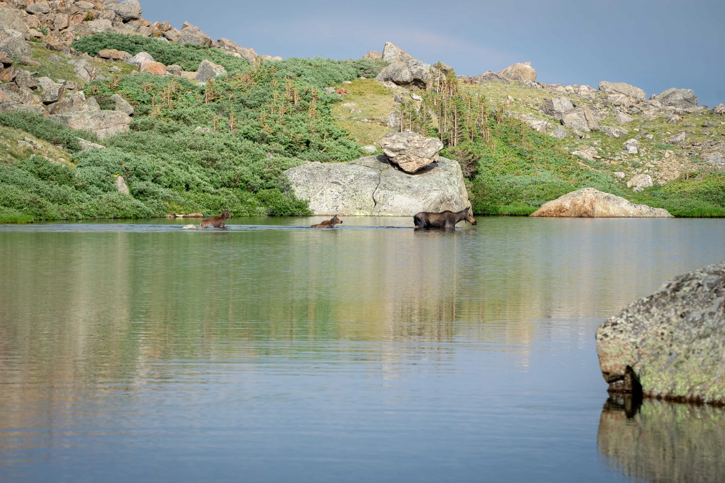 At King Lake, we decide to continue on the Bob and Betty Lakes Trail and find a campsite at Betty Lake. Just before the turn we see a moose and her two babies eating foliage near South Fork Middle Boulder Creek. I’ve never seen a moose in the wild so this is absolutely thrilling for me! Before I can switch to my 70-180mm lens, they disappear into the dense shrubs along the creek.