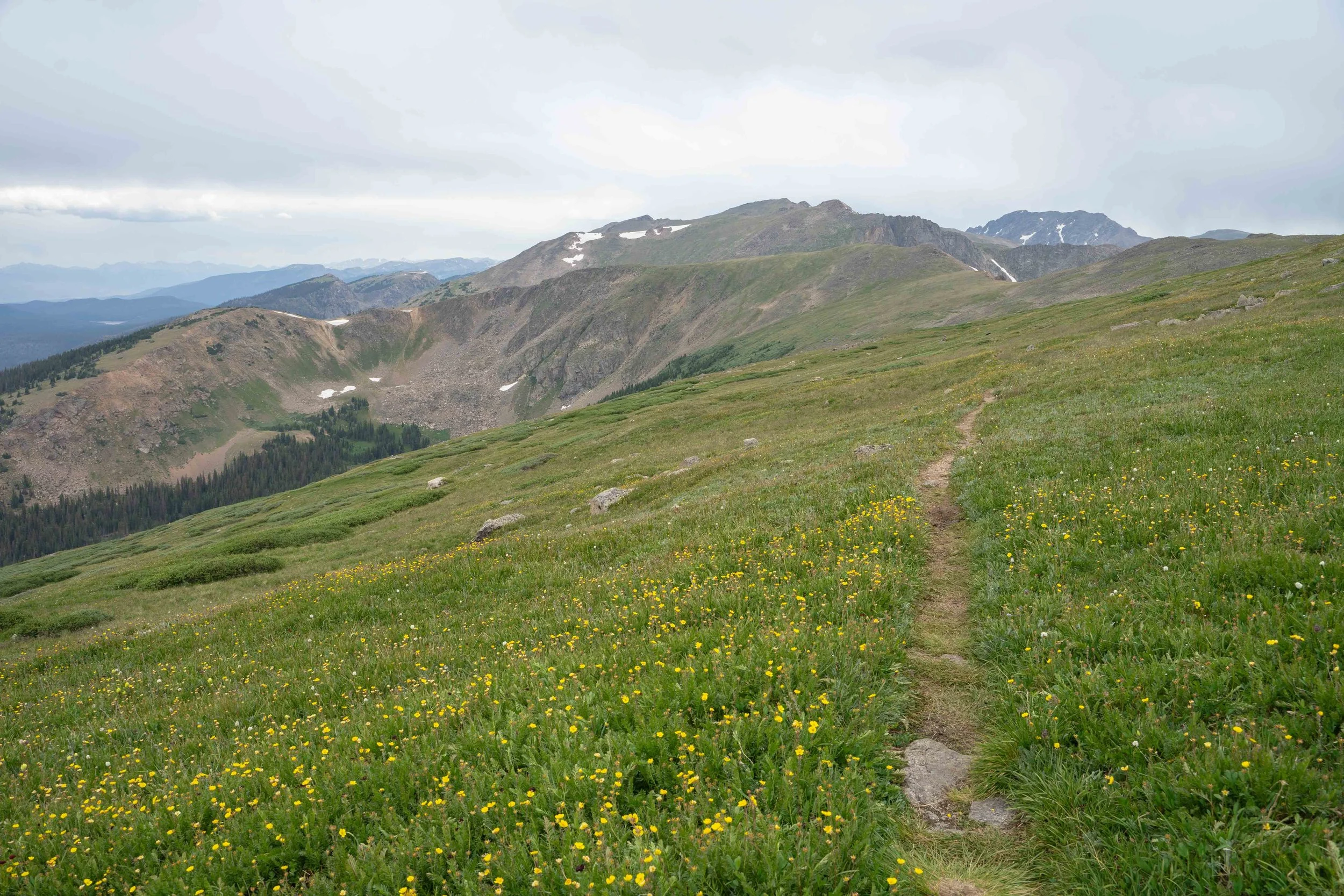 When we reach the Continental Divide/High Lonesome Trail I’m glad to have a break from the strenuous climbing. To the west, we can see Winter Park and the surrounding mountains. This photo below shows the Divide looking north.