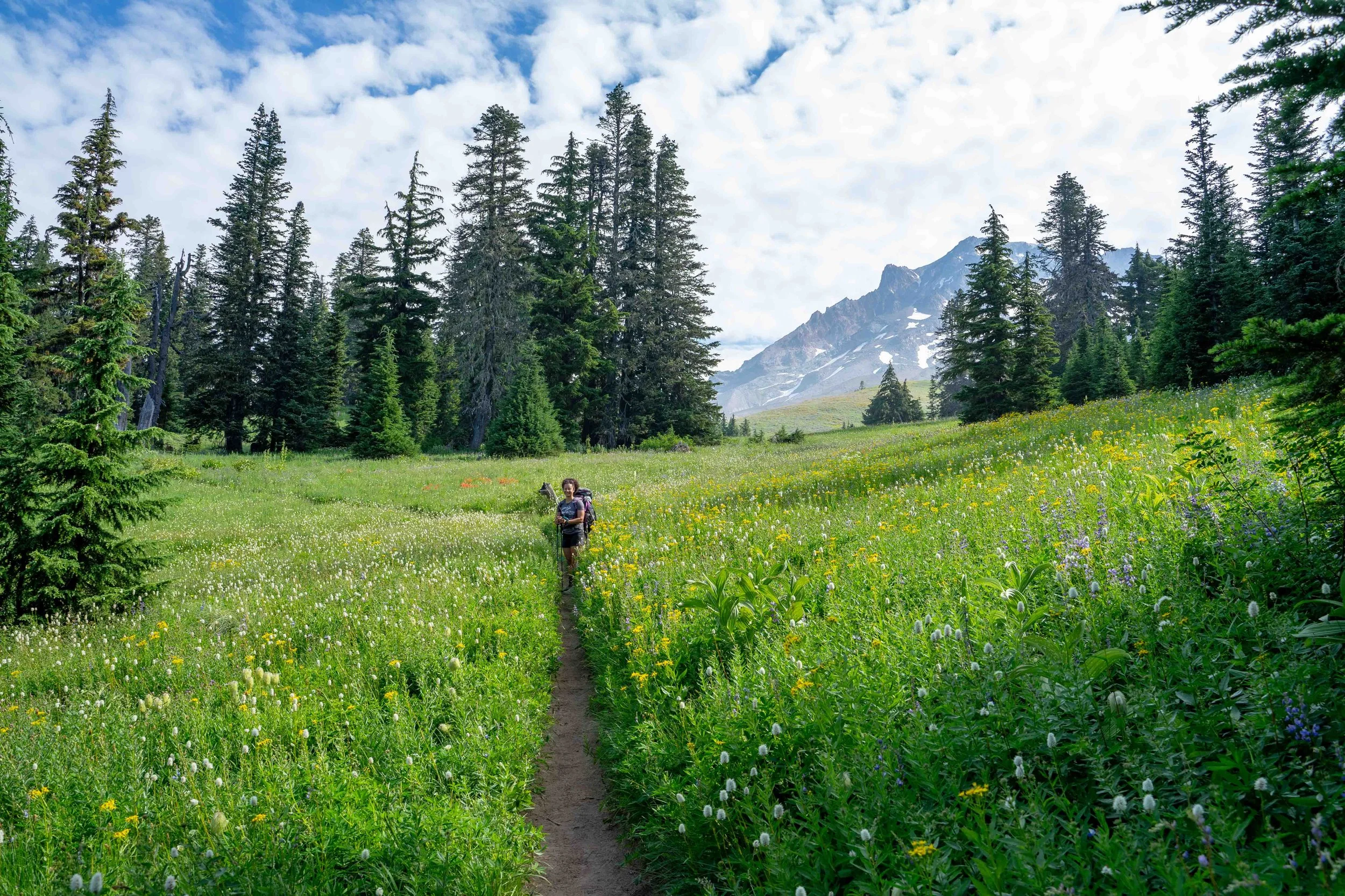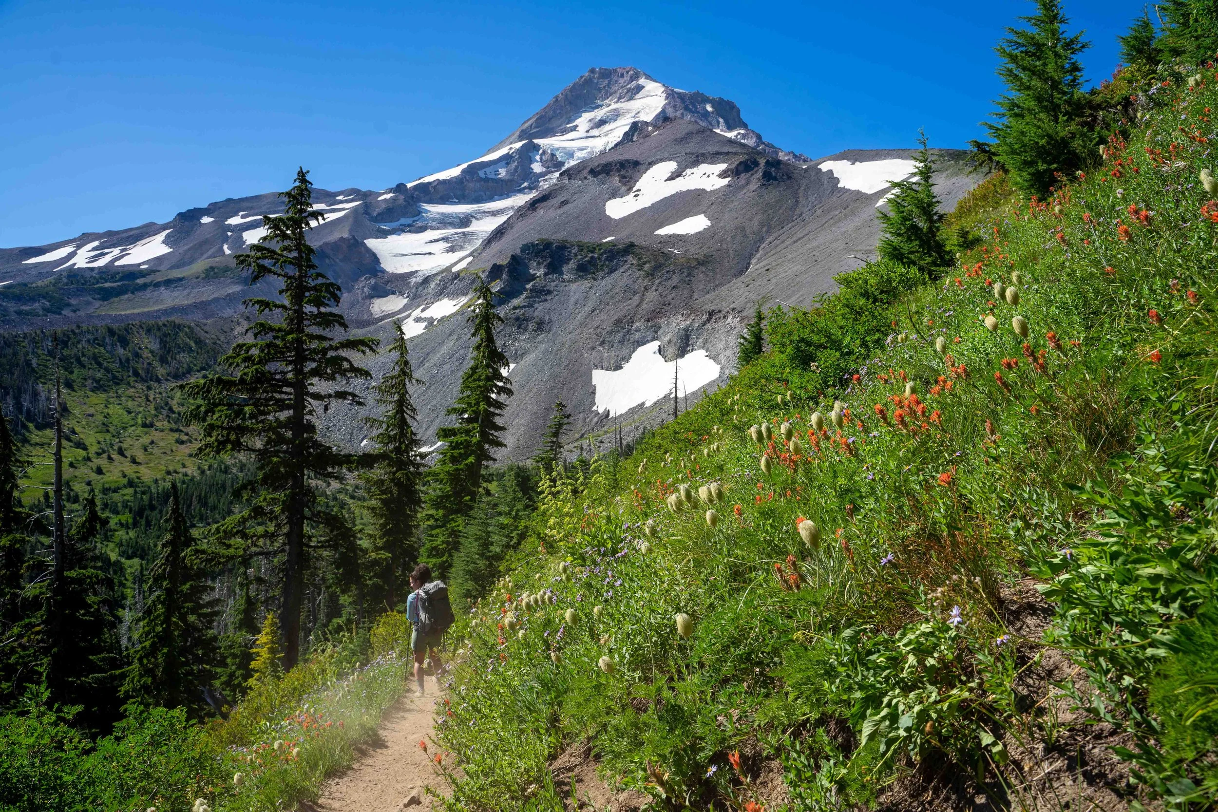 We hope to find a camp spot just past McGee Creek - near the McNeil Point Trail - about 3 miles from Top Spur. We filter water at the creek and continue climbing. When we reach the McNeil Point Trail we don’t find a suitable site (also there are no views of the mountain) so we continue to Cairn Basin where we know there should be ample sites. We cross Glisan Creek, climb a little more, and enter a wildflower filled meadow before entering Cairn Basin.